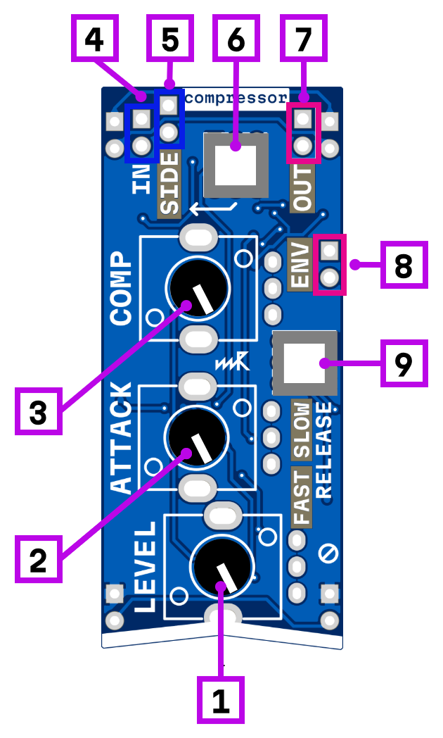 Compressor with adjustable threshold, attack, release, and output level. optional sidechain input and envelope output.