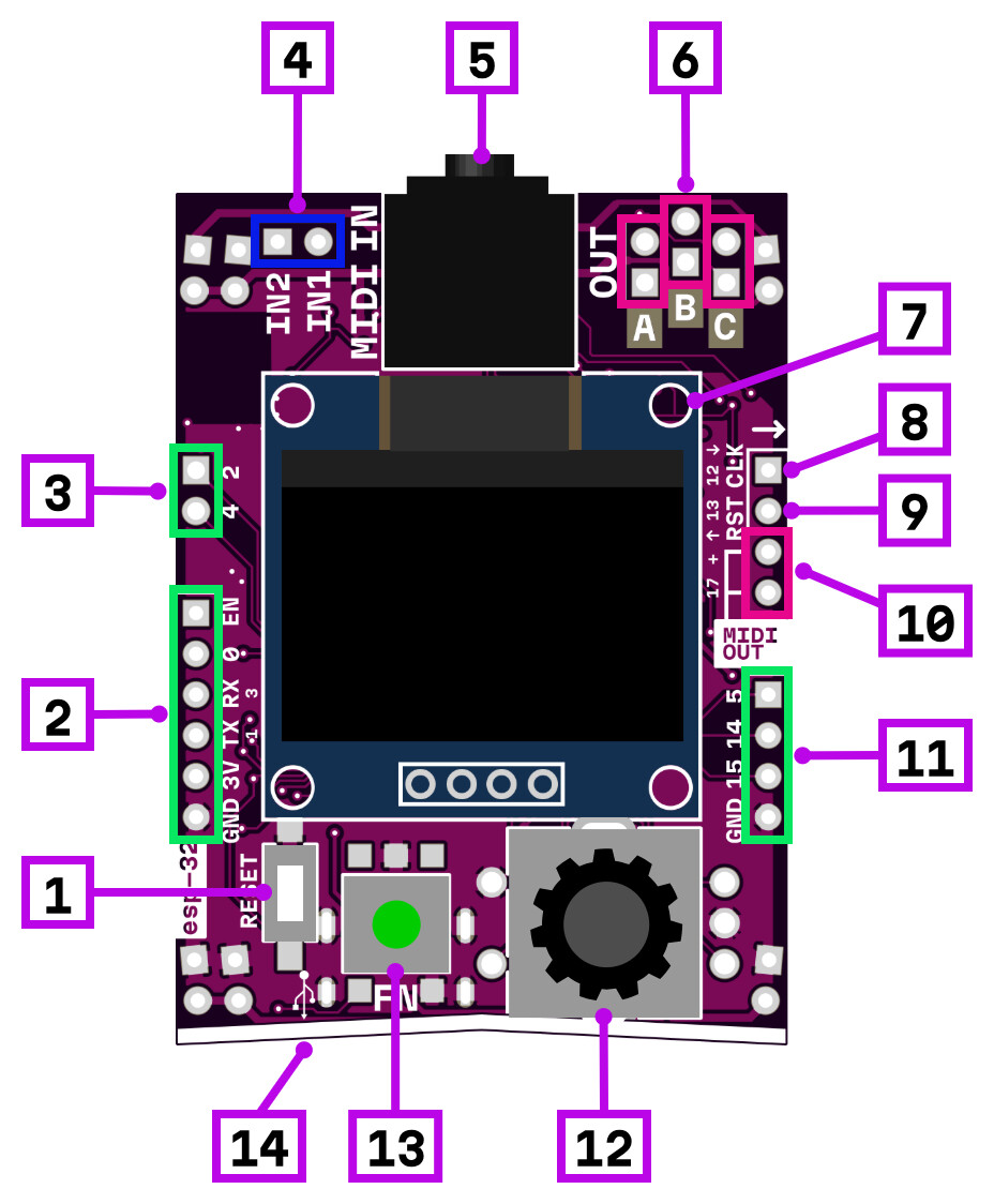 ESP32-D0 based programmable module with 4 MB flash, MIDI input, analog I/O, and user interface.