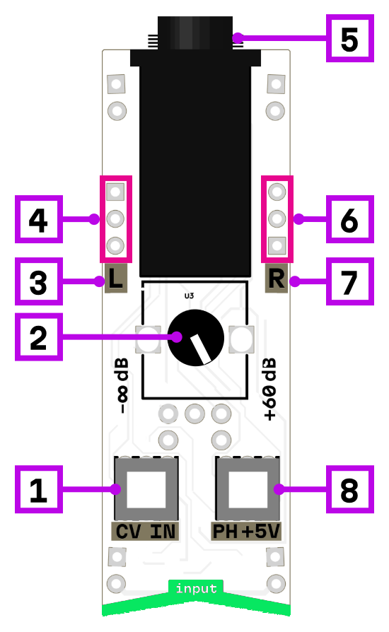 Stereo input preamplifier with wide gain range from -∞ to +60 dB. Features a +5V pull-up switch for powering electret microphones and expression pedals, and a CV/DC block mode switch for handling both audio and control voltage signals.