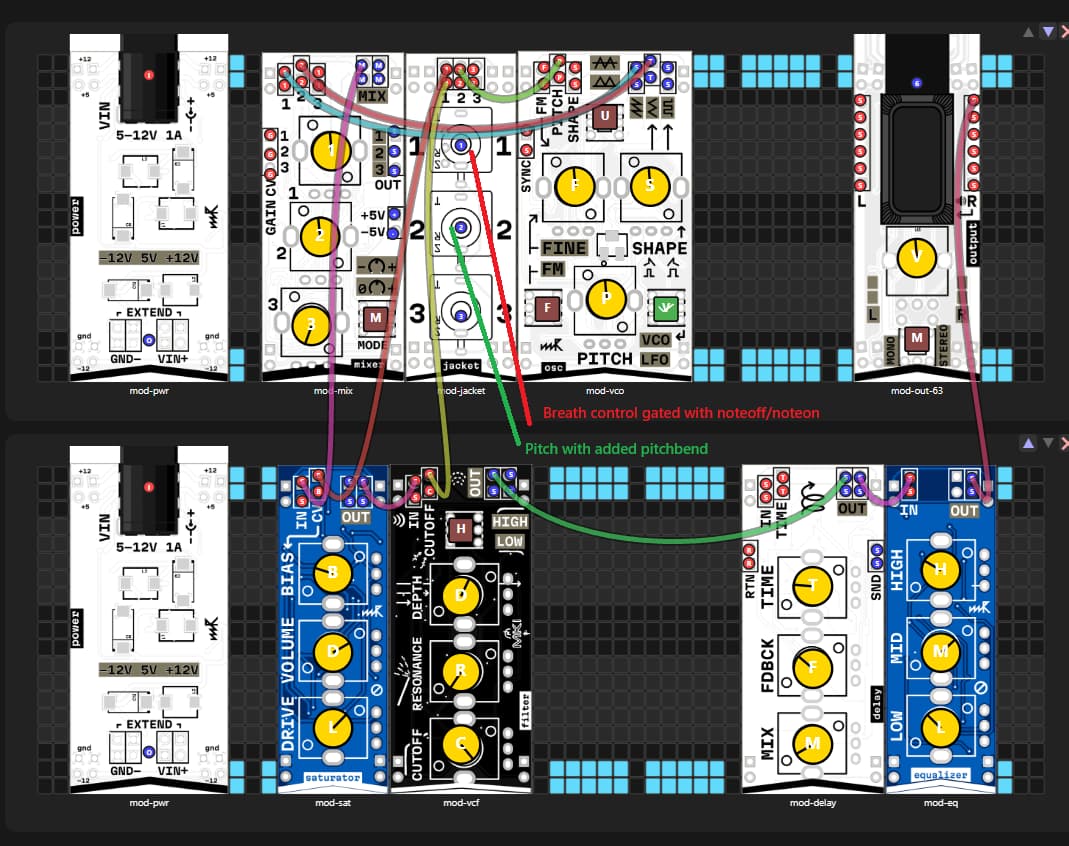 At this point, I have pitch+pitchbend combined in a single CV line, and breath control+note gate combined on other.