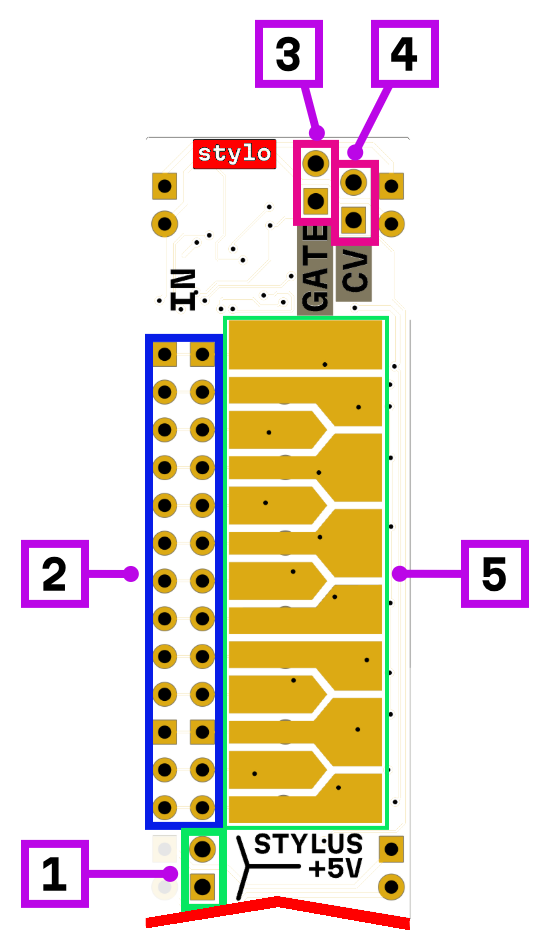 Connect an alligator clip wire or male-female jumper to the +5V pins. Now you can play: touching the keyboard pads outputs a Gate signal (5V) and a 1 V/oct CV signal (0V for the first C note, 1V for the last C note). The CV signal remains constant between key presses.