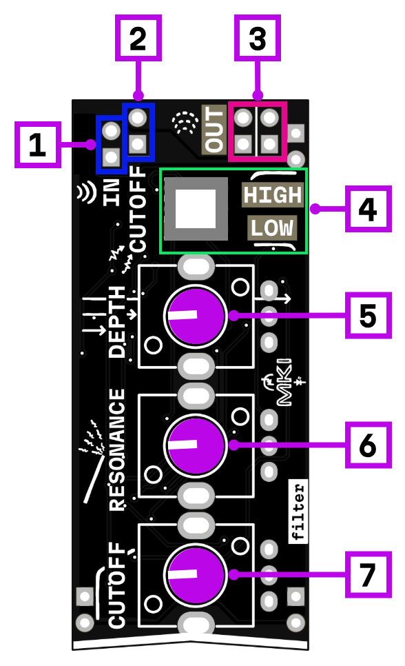 A voltage-controlled filter based on a diode ladder topology with resonance control and cutoff modulation.